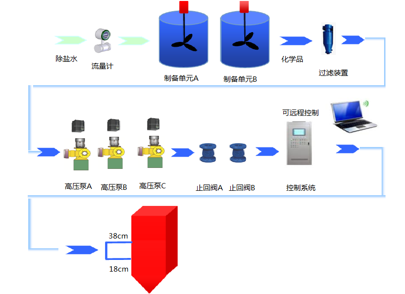 制備系統由高濃縮專屬配方化學藥劑儲存器、稀釋水接入裝置、高濃縮專屬配方化學藥劑接入裝置、攪拌系統、化學藥劑輸出管路與排污管路組成。制備系統根據主控單元指令,按照現場需求將高濃縮化學藥劑與稀釋水按照一定的比例進行調配,電動攪拌泵提供動力,攪拌系統對配好的化學藥劑進行攪拌,化學藥劑與稀釋水混合均勻后通過輸出管路,將化學藥劑輸送給噴射系統;