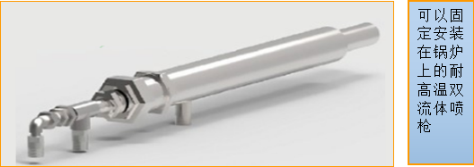 雙流體(耐高溫)噴槍使化學藥劑在噴出后的微粒直徑只有30μm~40μm,霧化效果更佳,化學藥劑更容易游離,加速化學藥劑與焦渣的反應,增加藥劑的覆蓋面。雙流體耐高溫噴槍主要是為遠程控制噴射系統而設計,可固定安裝在鍋爐上,滿足客戶24小時隨時噴藥需求,及時清除受熱面焦體。