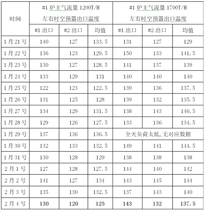 5、使用期間#1爐主氣流量為1200T/H或接近1200T/H時,#1爐排煙溫度變化;與#1爐主氣流量為1700T/H或接近1700T/H時,#1爐排煙溫度變化: